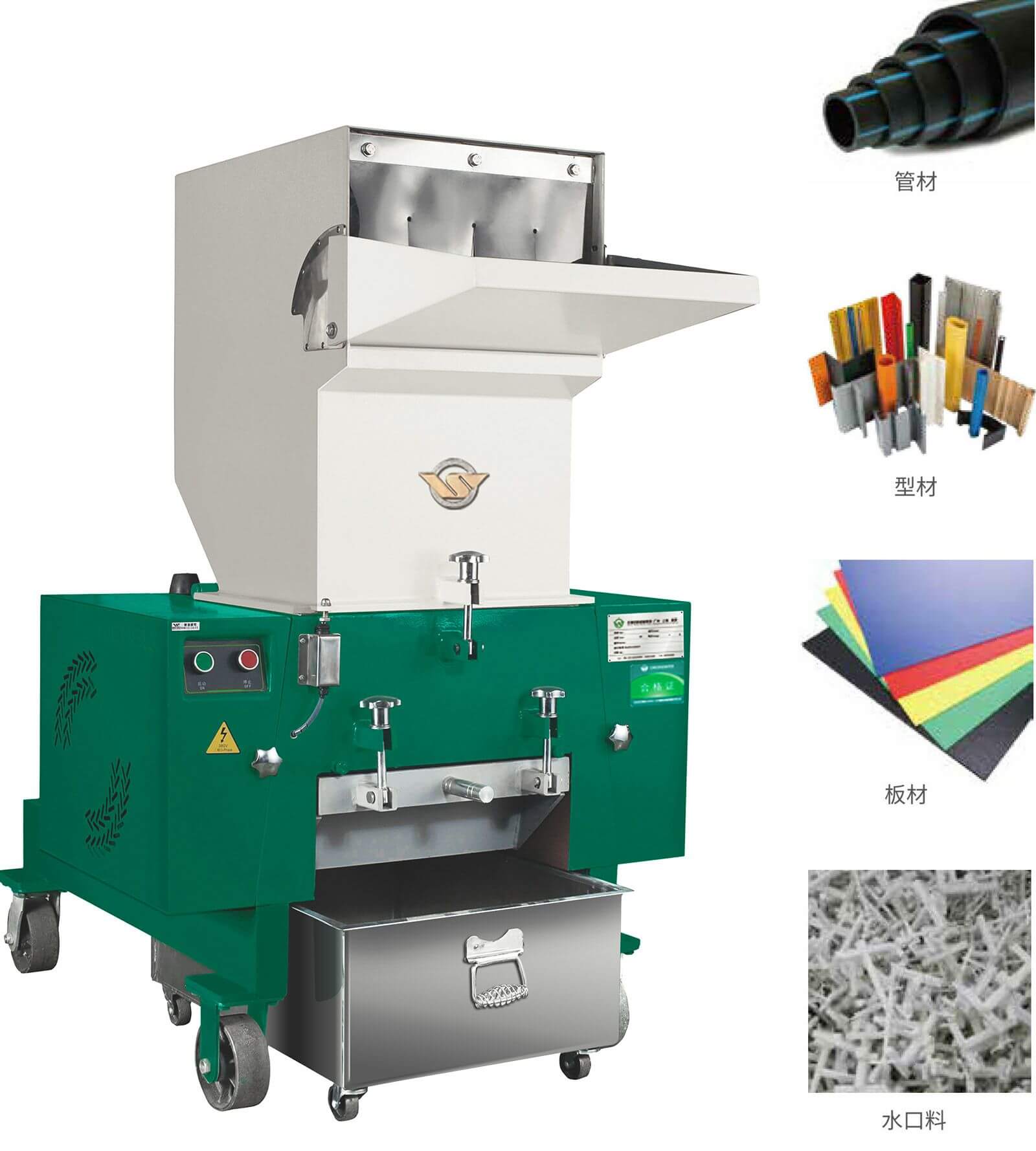 性能特點WSGP片型刀結構介于爪刀、平刀之間,适合破碎普通片材、管材、型材、闆材及包裝材料等塑料制品、澆道口。WSGD平型破碎機适用于箱類,薄管件,吹塑件、瓶、殼等塑料的回收。刀型設計合理,産品成粒均勻,省電耐用,高效經濟。動定刀間隙可調。設有多項安全保護裝置,确保操作安全。通用型塑料粉碎機,采用密封軸承,使軸承轉動長時間保持良好。加工工藝成熟,箱體、刀架等重要部件采用整體加工,确保配合精度。