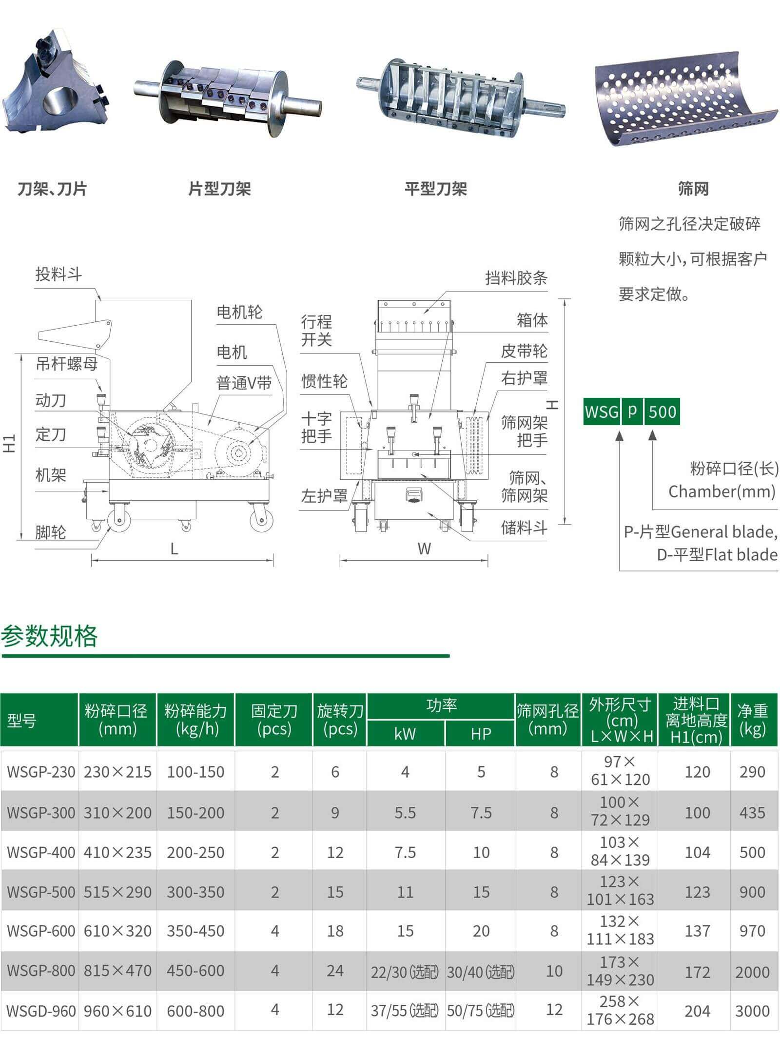 WSGP片型刀結構介于爪刀、平刀之間,适合破碎普通片材、管材、型材、闆材及包裝材料等塑料制品、澆道口。